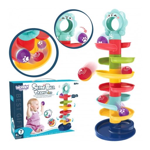 A készlet 8 színes toronyelemből és 2 különböző színű golyóból áll, amelyeket a gyermekek a torony tetejéről elindíthatnak. A labdák mozgás közben hangot adnak ki, ami még izgalmasabbá teszi a játékot, és tovább ösztönzi a kicsiket a felfedezésre.